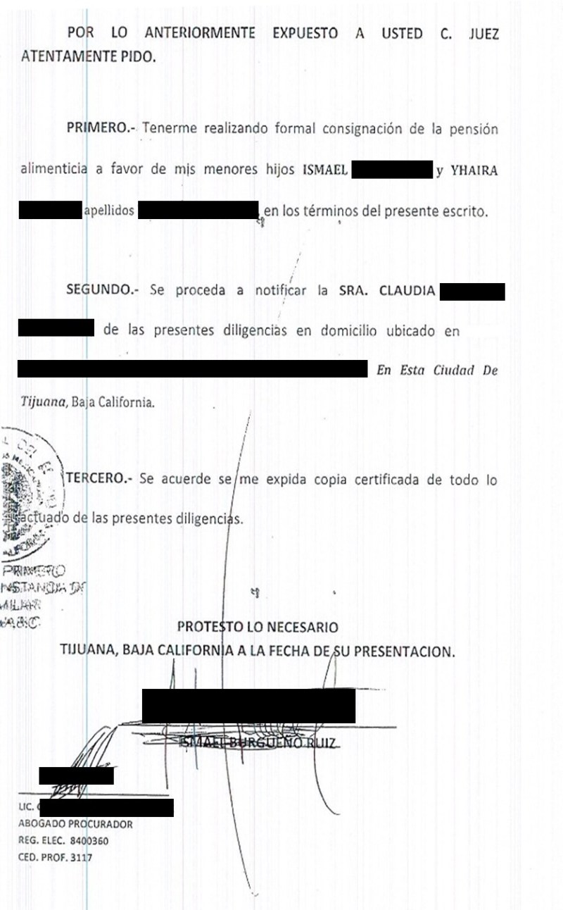 Para sacudirse esta bochornosa situación, el señor Ismael Burgueño, quien incluso fue dirigente del partido Morena en Baja California, trató de simular el haber consignado la pensión alimenticia en diciembre de ese año, a través de un comprobante del supuesto pago de 2 mil pesos.